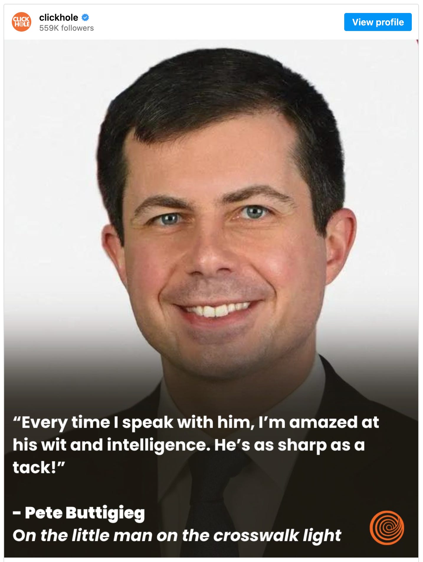 “We create some content specifically for our social pages, like our ‘They Said What?!’ celebrity quotes and various memes that we urge our followers to like and share,” LaConte says. Galbraith notes that ClickHole “tries to make headlines shorter for people’s attention spans and get to the punchline quickly — unless it’s a stylistic thing where the length and specificity is part of the joke and the appeal.”